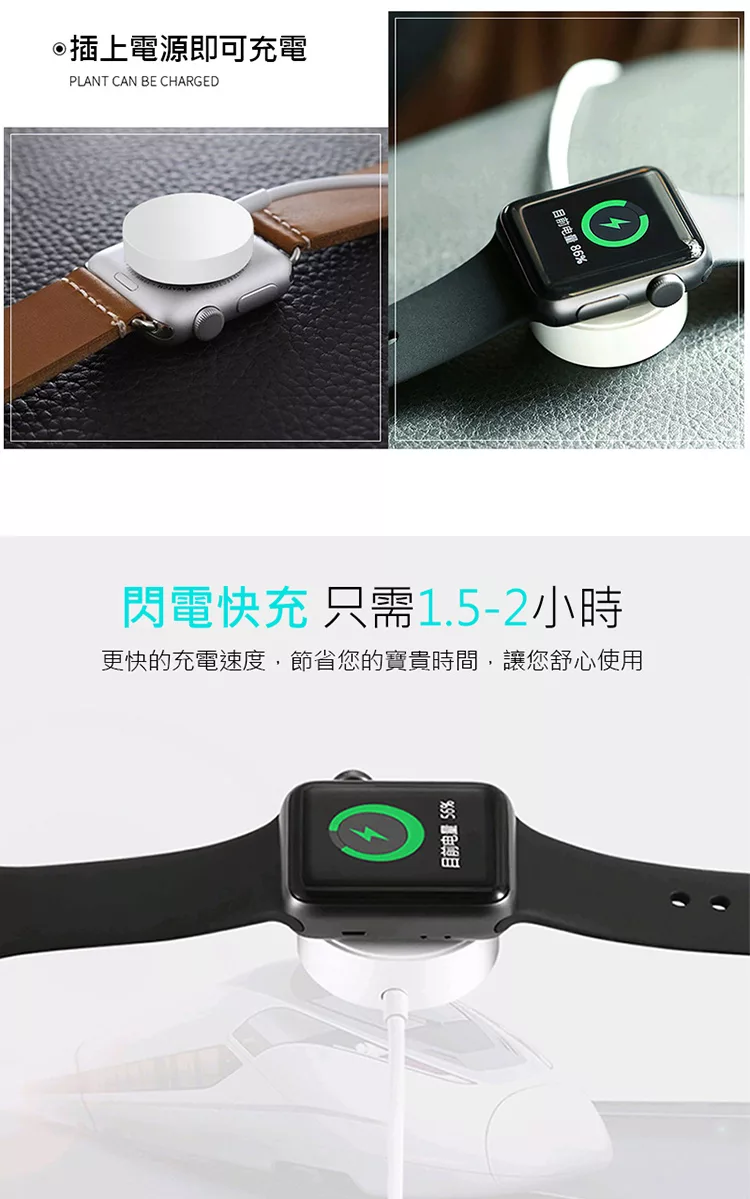 ▲充滿蘋果手錶1.5~2小時,隨時隨地適用;